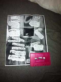 Well I picked this up from the A389 Bash 02/10 somewhat secretly, but I already cracked the case somewhere in between unwrapping the tissue paper wrapped case complete with button, like a schlub. I kinda bought this without listening to it online hoping for the surprise element to be just that. Turns out to be noise which I kinda knew going in but wasn't quite positive. Four tracks two per side all around 3 minutes in length. I don't always know how to judge noise tapes because well obvious reasons. But turns out this was type of noise a dig no harshness really, light harsh and eerie-ness, a mix of horror/sci-fi type of soundtrack. The few samples on here seemed to add to the overall feel rather than distract like a lot of samples tend to do. The tape itself flowed very well overall it was rather intriguing. It didn't drag which is what I feel most noise experiments people have tend to do, and I know that's the point with droning projects but those bore me all too often. If you are interested in hearing the tracks look to here http://highpriestess.bandcamp.com/album/mmxii-demo, the secret bash ones are gone, the first press of 25 are gone but there are intentions of a second press so keep an eye out here http://sheunholy.bigcartel.com/ or maybe I'll distract myself from reviews and post a news update up when I hear that they are on their way.